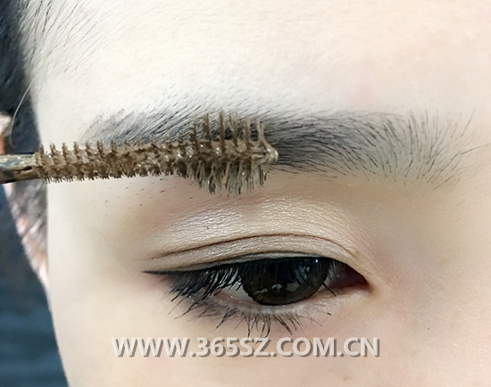 3.用轻松画三角眉笔填充眉部稀疏的部分,并用眉刷梳理,模糊掉先前画的轮廓线,胶状粉芯经过梳理后更增添眉毛的绒毛感