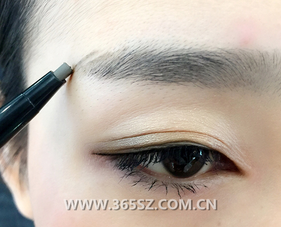 2.用轻松画三角眉笔根据画眉的完美比例描绘眉部大概轮廓,用眉刀轻柔的修理在轮廓外的杂毛